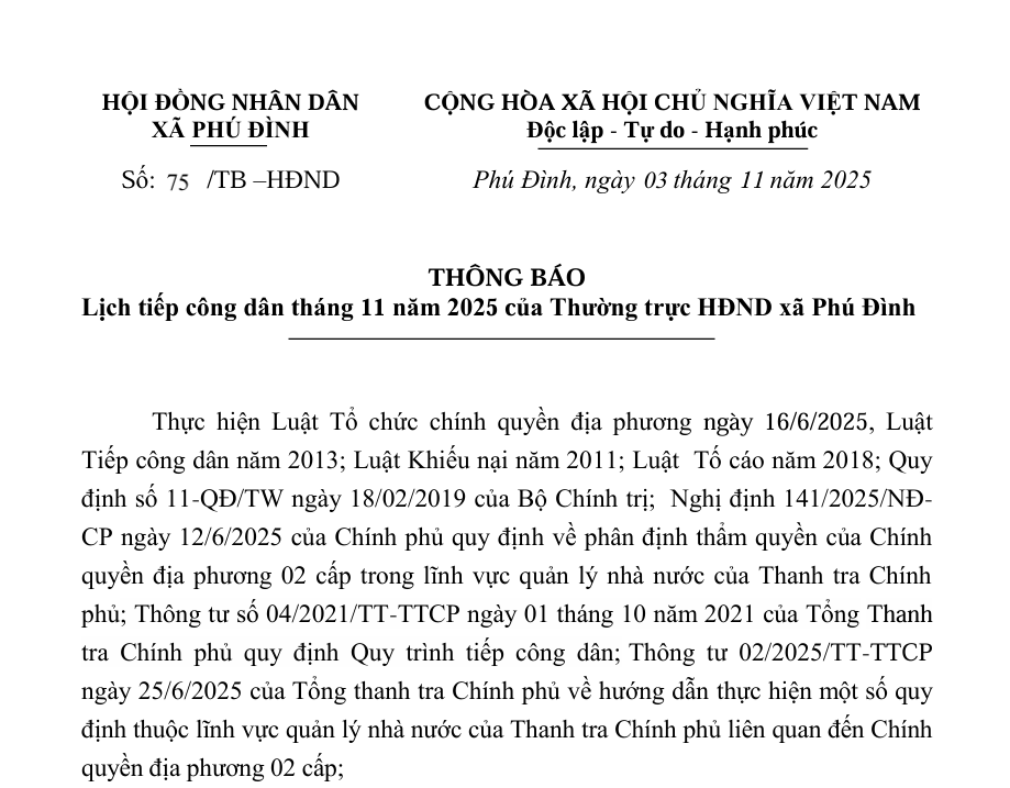 THÔNG BÁO LỊCH TIẾP CÔNG DÂN THÁNG 11 NĂM 2025 CỦA THƯỜNG TRỰC HĐND XÃ PHÚ ĐÌNH