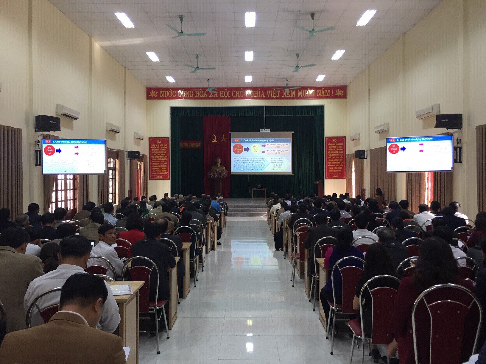 Sáng 23-11, Ban Bí thư Trung ương Đảng tổ chức hội nghị trực tuyến toàn quốc học tập, quán triệt, triển khai các Nghị quyết Trung ương 8 (khóa XII). Dự hội nghị tại điểm cầu chính có các đồng chí: Trần Quốc Vượng, Ủy viên Bộ Chính trị, Thường trực Ban Bí thư; Nguyễn Sinh Hùng, nguyên Ủy viên Bộ Chính trị, nguyên Chủ tịch Quốc hội; các đồng chí Ủy viên Bộ Chính trị, Bí thư Trung ương Đảng…Tại điểm cầu tỉnh Thái Nguyên, hội nghị còn được trực tuyến tới 9 điểm cầu các huyện thành thị trong tỉnh. Dự hội nghị tại điểm cầu huyện Định Hóa, có các đồng chí lãnh đạo Huyện ủy, HĐND, UBND, UBMTTQ huyện, lãnh đạo chủ chốt các cơ quan, ban ngành đoàn thể của huyện, các đồng chí Nguyên là lãnh đạo huyện Định Hóa,các đồng chí lãnh đạo chủ chốt 24 xã thị trấn trong huyện.